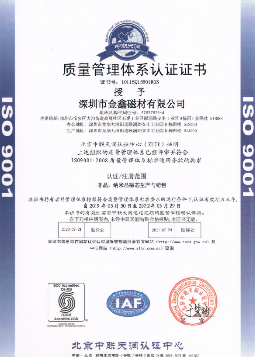 熱烈祝賀金鑫磁材通過國(guó)家ISO9001:2008質(zhì)量管理體系認(rèn)證