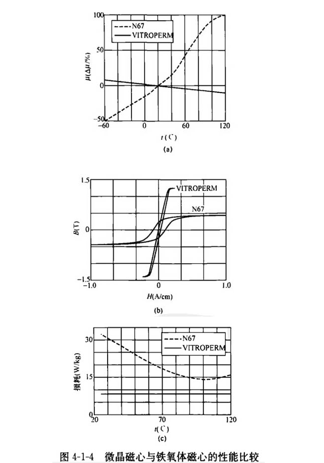 目前,高頻變壓器一般選用鐵氧體磁芯。VITROPERM 500F鐵基超微晶磁芯與德國(guó)西門子公司生產(chǎn)的N67系列鐵氧體磁芯的性能比較如圖所示。圖a為磁導(dǎo)率的相對(duì)變化率與溫度的關(guān)系曲線;圖b為磁感應(yīng)強(qiáng)度(B)與矯頑力(H)的關(guān)系曲線;圖c則為損耗—溫度曲線。 ...